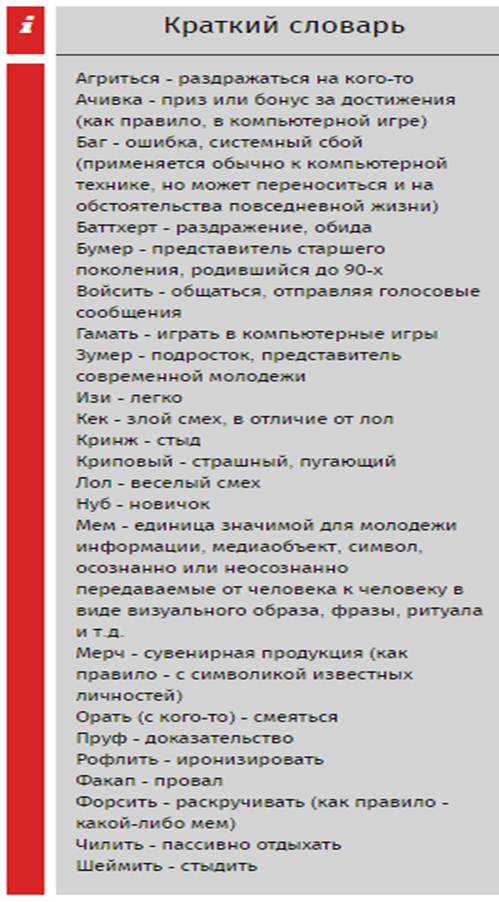 – Молодежные сленги всегда были и будут. Это дает подросткам возможность чувствовать себя более независимо от взрослых, обозначить свою принадлежность к «своим», почувствовать себя в «своей стае», – поясняет детский и семейный психолог Надежда Гольбрайх. – Не мешало бы учителям русского языка и литературы проводить уроки, на которых вместе со школьниками составлялись бы словари с расшифровкой молодежных терминов и ставилась задача вместе найти аналоги в русском языке.